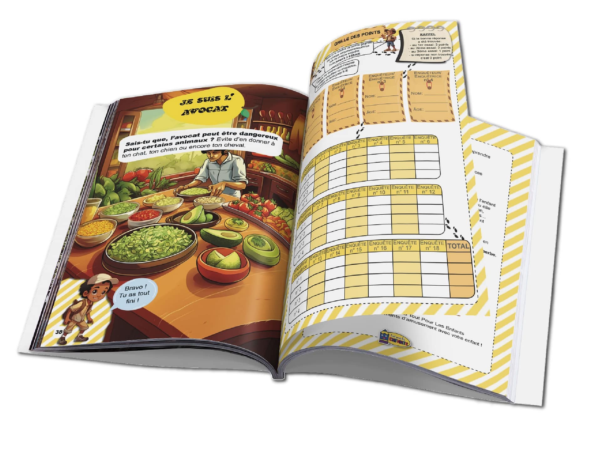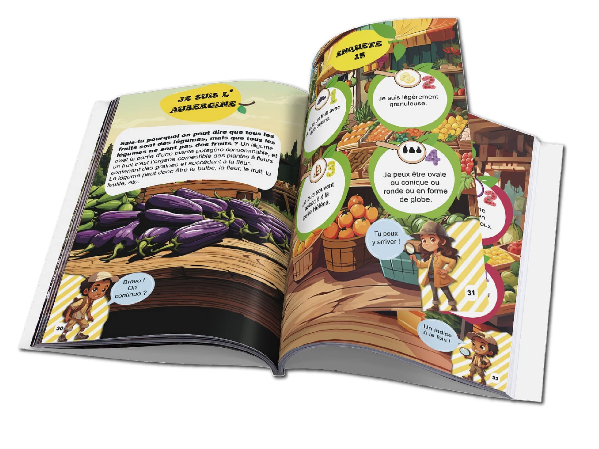 Le livre d’enquête fruits et légumes est disponible en version papier et aussi en version ebook. Avec ses 41 pages colorées et joliment illustrées, notre livre «J’enquête avec les Fruits et Légumes avec Tia et Leo » est bien plus qu’un simple livre d’énigmes, il attise la curiosité de votre enfant pour la nature. C’est un super moyen d’enrichir sa culture générale du potager et du verger tout en s’amusant. Offrez à votre enfant ce cadeau ludique dès aujourd’hui !